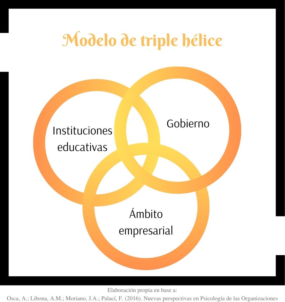 Este modelo, que pretende fomentar el desarrollo económico y social a través de la innovación, sugiere la necesidad de que existan interacciones entre el ámbito empresarial, el gobierno y las instituciones educativas; generándose interconexiones, entre los tres elementos, que permitan generar entornos de colaboración propicios para el surgimiento de organizaciones híbridas que faciliten y promuevan el surgimiento de innovaciones.